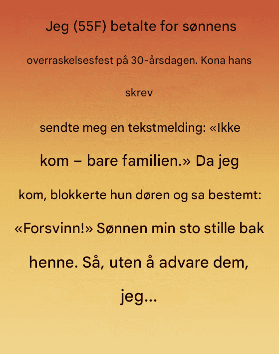 Jeg tryglet ikke. Jeg protesterte ikke. Jeg snudde meg bare og gikk. Men før jeg gjorde det, ga jeg henne et blikk – et rolig, endelig et. Blikket som sier at en dør har lukket seg, ikke med drama, men med stille besluttsomhet.